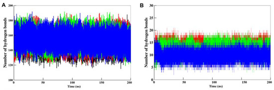 Intramolecular H-bonds formation is quite important in maintaining the integrity of protein structure [86]. The analysis of intramolecular H-bonds during MD simulation is useful to examine the impact of ligand binding on the protein structure. At the same time, the analysis of intermolecular H-bonds is useful to see the lifetime of interactions formed between the protein and ligand. This work monitored the time evolution of H-bonds, with the distance cutoff set to 3.5 Å. The resultant plots of intramolecular and intermolecular H-bonds analysis for all the four systems in MD simulations are shown in Figure 5. The generated plot showed an overlapped pattern of intermolecular H-bonds distribution that suggested that CK1a maintained its structural integrity during the simulation even after compounds binding (Figure 5A). This analysis of intermolecular H-bonding also indicated that the compounds haven’t moved from their initial docking position on CK1α and maintain the interactions in stabilizing the complex structures (Figure 5B).
