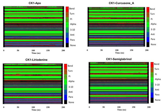 Secondary structure components in a protein maintained its 3D structure and regulated the flexibility/rigidity of the protein in a natural system [87,88,89,90]. To see the impact of compounds binding on CK1α, the dynamics of secondary structure components were monitored (Figure 6). The generated graphs show the participation of each residue in secondary structure formation overtime during the entire simulation. The secondary structure panels of each system generated through the simulated trajectory indicated the stable pattern over 200 ns simulation. The result suggested that secondary structure components of CK1α protein are conserved before and after the binding of each compound during the entire simulation. The average number of residues participating in the secondary structure formation is summarized in (Table 4).