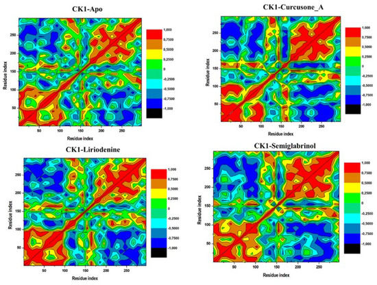 Motions in a protein take place on a comprehensive range of time scales, extending from femtoseconds to seconds [91]. DCCM also depends on the time scale over which the correlation data was composed [92]. To explore the correlated and anti-correlated movements in CK1α and its docked complexes with Curcusone_A, Liriodenine, and CK1α-Semiglabrinol, the inter-residue DCCM analysis was carried out. Four DCCM plots generated for the CK1α and its docked complexes are illustrated in Figure 7. Positive and negative correlations are shown in red and blue, respectively. The maps indicated that CK1α scattered into different populations through positive and negative correlations with reference to the residue index. The movements in all maps were relatively alike with minor fluctuations, suggesting that CK1α may have similar global dynamics before and after compound binding. Overall, the correlation patterns in all the graphs are weakly differentiated, suggesting the stability of the movements in free CK1α and its ligand-bound complexes.