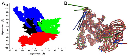 Principal components analysis (PCA) is a highly useful approach in pattern recognition in protein movements [71]. In PCA, two-dimensional plotting of two different eigenvectors (EVs), i.e., EV1 and EV2, is produced by clustering them [27,33,72,73]. PCA was performed through the covariance matrix C, based on the atomic coordinates of Cα atoms and their corresponding eigenvalues [74]. The generation of positional covariance matrix C is defined below:
