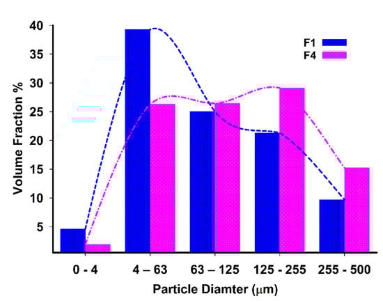Figure 1 shows the results of particles size and distribution analysis carried out on F1 and F4 (See Table A1 for further details). A negatively skewed distribution for F1 and F4 was observed. The median particle size for F1 was around 74 μm, while that for F4 was 112.4 μm. Almost 15.2% of F4 had the particle size of 255–500 μm, while only 9.7% of F1 had the latter size. Data also show that F4 possessed a larger particle size fraction than F1, which could be attributed to the significant contribution of the added Carbomer® on increasing the particle size. On the other hand, the span values for F1 and F4 were 2.52 and 3.21, respectively. These results indicated that F4 has a statistically (p < 0.05) wider size distribution and higher polydispersity as well.