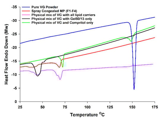 As shown in Figure 2, an endothermic peak at 150 °C corresponding to the melting point of pure VG was observed. Gelucire®50/13 and Compritol® showed endothermic peaks corresponding to their melting points at 50 °C and 72 °C, respectively. A physical mixture of the VG and Gelucire®50/13 (1:8) showed a very small endothermic peak at 150 °C, which corresponds to VG, while the same ratio of the drug mixed with the Compritol® showed a larger peak of VG as an indication that VG was better solubilized in the molten Gelucire®50/13 when compared with Compritol. On the other hand, the spray congealed MP representing all of the formulations (Table 1) showed only the endothermic peaks, which correspond to the lipid carriers but not VG. The DSC results indicate that VG was dispersed in its semicrystalline form, mostly in the Gelucire®50/13 fraction of the mixture.
