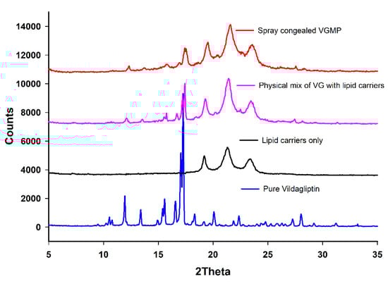 As shown in Figure 3, the X-ray diffraction analysis of VG powder showed several peaks between Bragg angle 2θ of 10 to 27, with a high intense characteristic peak at 17θ. The mix of lipid carriers showed three different peaks in the range between 18 and 25θ. The XRD crystallography of VG in the lipid carriers, particularly those of SPC formulation, showed that much of VG peaks disappeared or decreased intensity compared to pure VG or VG in other mixes, confirming that a significant portion of the loaded VG was dispersed in its semicrystalline to amorphous form in the molten lipids. The XRD results of the lipid carriers matched those reported earlier [].
