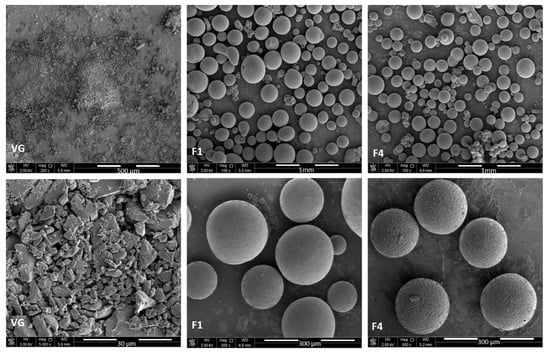 As shown in Figure 4, the VG powder possessed a crystal-like shape. In contrast, the F1 microparticles showed a dense spherical shape with a smooth surface, similar to what was observed previously in other reported studies involving Gelucire®50/13 or Compritol® as lipid excipients [,]. On the other hand, the VG microparticles containing Carbomer® also tended to form spherical microparticles, but with more rough surfaces, suggesting that Carbomer® inclusion had a role in increasing the size and roughness of the surface of the prepared SPC particles.