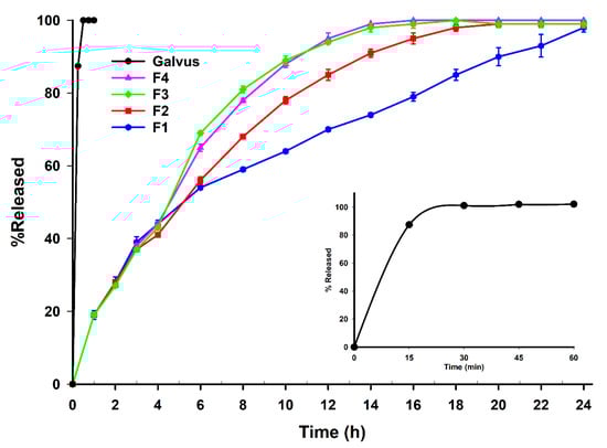 As can be seen from the analysis in Table A3 and the dissolution profiles in Figure 5, the initial 50% release in the first 6 h of F1 followed a typical non-Fickian diffusion. After that and up to 24 h, the release of F1 followed typical zero-order kinetics (R2 = 0.997), where the dissolution of VG was only a function of time. It was previously reported that many other drugs, such as Theophylline, followed the Higuchi diffusion mechanism once prepared by SPC using Compritol® alone []. However, in our case, all the other formulations (F2–F4) followed the Korsmeyer–Peppas model with anomalous transport, which indicated that the release of the drug depended on combined swelling and diffusion mechanisms of release []. This was clearly demonstrated through the bimodal release pattern that the carbomer inclusion in the formulation caused. Finally, Galvus® marketed tablets followed a typical first-order release profile in which the release rate was proportional to the concentration of VG, as reported earlier [].