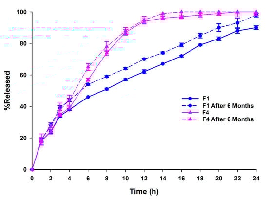 F1 and F4 were also subjected to aging effect investigation, as many studies have reported on the polymorphism of Gelucire®50/13, which led to changes in the release profile of many drugs []. As shown in Figure 6, the release profiles for VG were not altered during the storage period of 6 months at 4 °C. On the other hand, the calculated similarity factors (f2) for F1 and F4 were found to be 60 and 76, respectively. This confirmed that the dissolution profiles of the stored formulations were similar to those of the freshly prepared formulations. The aging effect did not significantly affect the drug release.