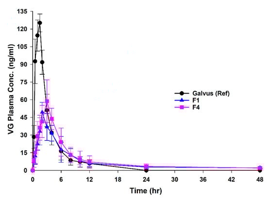 Plasma concentration-time profile of 100 mg F1 and F4 tested tablet formulations versus Galvus® 50 mg as a single oral dose of VG. Values are mean ± SD (n = 9).