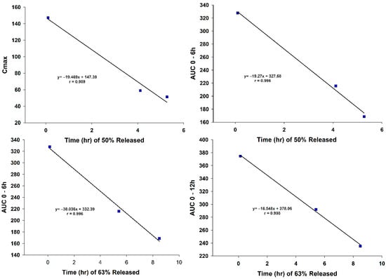 At this level of correlation, pharmacokinetics parameters, including Cmax, AUC, and Tmax, are correlated with different dissolution time levels covering the early, middle, and late stages of the dissolution profiles []. The Cmax, Tmax, and different partial AUCs were plotted against the corresponding in vitro data obtained through the Weibull model (see Equation (3)), as reported in Table 4 [].
