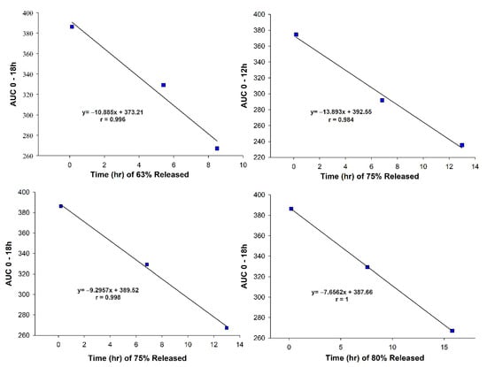 There was a linear correlation between the extent of absorption and different parameters of in vitro release. The AUC0–6 was correlated to the T50% and Td with a correlation coefficient of r = 0.996, confirming a linear relationship between the studied parameters, as shown in Figure 8. Furthermore, the AUC0–12 was correlated with Td and T75% with a correlation coefficient of r = 0.998 and r = 0.984, respectively, but the higher correlations were with the Td, as shown in Figure 8 and Figure 9. There was a linear relationship between the AUC0–18h and the time for releasing 80% of VG (T80%) with a correlation coefficient reaching unity. Similar results were obtained with T75% and Td with a correlation coefficient of r = 0.998 and r = 0.984, respectively. These results showed a linear relationship between the extent of absorption of the VG for different times with the corresponding in vitro dissolution results, as demonstrated in Figure 8 and Figure 9.