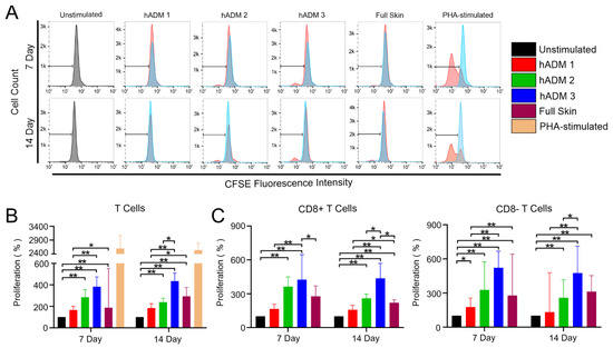 hADM preparation method induces differential T cell proliferation. Flow cytometric analysis of T cell proliferation. CFSE-stained PBMCs were co-incubated alone, with hADMs, with full skin, or with mitogenic control (lectin PHA) for 7 or 14 days. (A) Histograms displaying proliferation of whole T cells for 7 and 14 days. (B) Quantification of whole CD3+ T cell proliferation. (C) Quantification of CD3+/CD8+ and CD3+/CD8− T cell proliferation. Results expressed as medians + interquartile ranges. Two-tailed Wilcoxon matched-pairs signed-rank test used for (B,C). n = 5 with 2 technical replicates; * p < 0.05. ** p < 0.01.