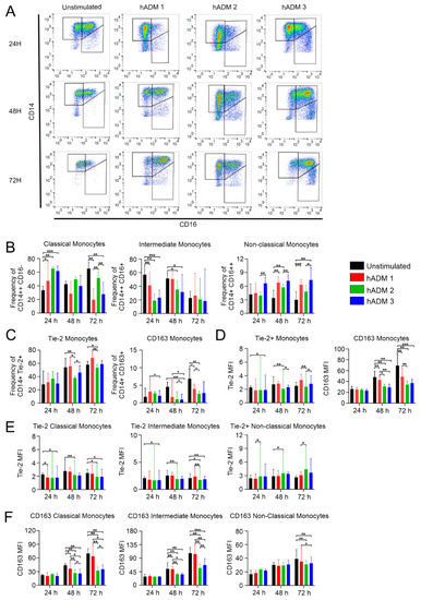 We found no differences in the frequency of Tie-2-expressing monocytes after 24 h incubation (Figure 2C). However, at 48 h, the frequency of analyzed cells was lower after incubation with hADM 2, while no differences were observed at 72 h compared to the unstimulated cells (Figure 2C). The frequency of CD163-expressing monocytes did not change after 24 h stimulation when compared to the unstimulated control. However, at 48 h, we found a lower frequency of analyzed cells incubated with hADM 3 compared to the unstimulated control, and similarly at 72 h in cells incubated with hADM 2 and hADM 3 (Figure 2C). Similarly, no differences in CD163 expression were observed at 24 h. In the latter time points, we found a significantly lower expression level of CD163 on monocytes when compared to unstimulated control. Interestingly, cells incubated with hADM 2 and hADM 3 showed lower levels of analyzed molecules when compared to hADM 1 (Figure 2D). Unexpectedly we found no differences in the frequency of IL-10 and TNF-producing monocytes (Figure 3B). However, at the 48 and 72 h time points, IL-10 and TNF expression (defined as MFI) was lower in hADM 2 and hADM 3, but not hADM 1 co-incubated cells versus unstimulated control (Figure 3C).