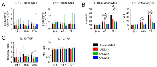 Monocyte effector function is modulated by hADM coincubation. Healthy donor PBMCs were co-incubated alone or with hADMs for 1, 2, or 3 days. A total of 2 h before collection, protein transportation was inhibited. Finally, cells were permeabilized and stained extracellularly and intracellularly before being examined by flow cytometry. (A) Frequency of CD14+/IL-10+ or TNF+ monocytes. (B) MFI quantification of CD14+/IL-10+ or TNF+ monocytes. (C) Frequency and MFI ratios of IL-10:TNF. Results expressed as medians + interquartile ranges. Two-tailed Wilcoxon matched-pairs signed-rank test used for (A–C) n = 5 with 2 technical replicates; * p = 0.05, ** p = 0.01.