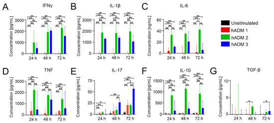 Having found significant changes in T cell proliferation and monocyte activation, we next wished to analyze levels of pro-inflammatory IFNγ, IL-1β, IL-6, TNF, IL-17 and anti-inflammatory IL-10 and TGF-β in cell culture supernatants (Figure 4). We found that hADM 2 and hADM 3 induced pro-inflammatory profiles, with high levels of IFNγ, TNF, IL-1β, and IL-6 when compared to both unstimulated control and hADM 1 (Figure 4A–D) in all analyzed time points. In contrast, levels of IL-17 were relatively low at 24 h, with increasing concentrations observed in the later time points. In fact, hADM 3 showed the highest level of IL-17 in analyzed samples. In hADM 2 and hADM 3, we observed a trend to increase IL-17 levels at 48 h, and which reached statistical significance at 72 h time point (Figure 4E). The highest levels of IL-10 were observed in PBMCs after incubation with hADM 2 (Figure 4F). Although hADM 3 induced moderate IL-10 secretion, this was still significantly greater than hADM 1 and the unstimulated control. Finally, TGF-β was measured, but the concentrations observed in the supernatant were very low (Figure 4G). Significantly higher levels of TGF-β were observed only in cell culture supernatants from PBMC incubation with hADM 2 at 48 h and hADM 3 at 72 h time points (Figure 4G).