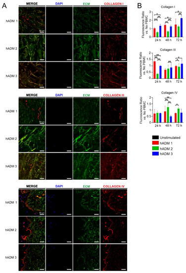 First, we found no visible differences in the structures of all three analyzed hADMs after coincubation with PBMCs (Figure 5A). PBMCs were located on the apical portion of hADMs and did not penetrate to the deeper layers of the matrix. Interestingly, in the apical site, fragmentation of collagen IV was observed. Moreover, we found the co-localization of mononuclear cells with collagen IV fragments, suggesting phagocytosis of released fibers (Figure 5A). Next, we quantified type I, III and IV collagens after hADM coincubation with PBMCs relative to hADMs incubated alone (Supplementary Figure S6). Interestingly, we observed slight but significant differences in the density of various collagen fibers in all three analyzed time points, namely at 24, 48 and 72 h. The presence of collagen I was lowest in hADM 2 compared to analyzed counterparts in all analyzed time points, while hADM 3 presented the highest content of collagen I after 24 and 72 h incubation. In contrast, collagen III was higher in hADM 1 at 24 h and further decreased at 48 and 72 h when compared to hADM 3. Again, hADM 2 showed the lowest density of collagen III fibers after incubation in the presence of PBMC among analyzed matrices. In contrast, no differences were observed in the density of collagen IV among analyzed hADMs at 24 h, while at 48 h, hADM 2 showed a slightly higher level of this collagen. However, at 72 h, the collagen IV level in hADM 1 was lower when compared to hADM 2.