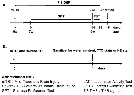 Timeline for the experimental procedure. (A) General experimental procedure for evaluating the depression-like behavior in mTBI treated animals. (B) The experimental procedure for evaluating the brain damage in mTBI and severe-TBI treated animals.