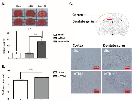 Evaluation of the mTBI-J induced cerebral damage and brain edema. (A) Animals are divided into sham, juvenile mild traumatic brain injury treated (mTBI-J), and severe traumatic brain injury. The percent of the total white area was a significant increase in the severe-TBI group, and no significant difference was between mTBI-J and sham control groups. (B) The significant difference in the edema between sham and after mild traumatic brain injury 24 h. (C) Results of the H&E stain did not reveal significant neural damage in the cerebral cortex and hippocampus. Values are shown as mean ± SEM, ** = p < 0.01 compared with the sham control group.