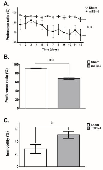 Examine the depression-like behavior in the mTBI-J rats. (A) The preference ratio of the mTBI-J group in the sucrose preference test was decreased compared with the sham group (two-way ANOVA, p = 0.0079). (B) The average preference ratio was summarized, and a significant difference was found among the mTBI-J and sham control groups. (C) The immobility percentage in the forced swimming test was significantly increased in the mTBI-J animals. Data was presented as a mean ± SEM (* = p < 0.05, ** = p < 0.01).