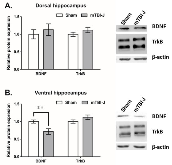 Both BDNF and TrkB have been involved in the depression-like behavior of adult TBI-treated rats or mice [68,69,70]. We performed a western blot to evaluate BDNF and TrkB expression in the ventral hippocampus (vHip) and dorsal hippocampus (dHip). Briefly, rats were sacrificed at nine weeks old following behavioral experiments. Results showed that only the BDNF in vHip was significantly decreased in the mTBI-J treated animals (unpaired t-test, two tail, t = 3.094, df = 11.39, p = 0.01, N = 8 per group), but no significant difference was found between the TrkB in the mTBI-J group and sham group (unpaired t-test, two tail, t = 1.062, df = 13.45, p = 0.3071, N = 8 per group) (Figure 4B). No significant changes in the BDNF and TrkB were found in the dHip (unpaired t-test, two-tailed, t = 0.7729 and 0.888, df = 13.55 and 11.04, p = 0.4529 and 0.3935, N = 8 per group) (Figure 4A).