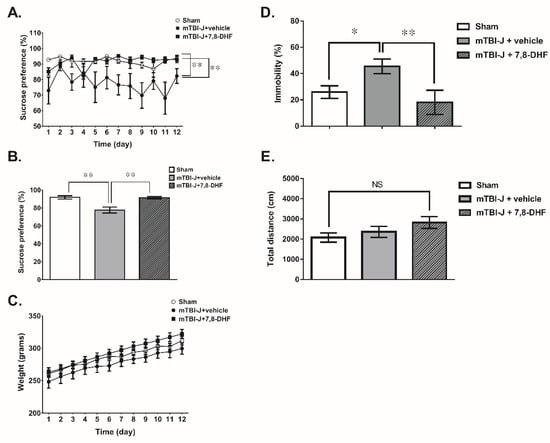 Results showed the sucrose preference ratio was restored after 7,8-DHF treatment (two-way ANOVA, F(1, 18) = 14.94, p = 0.0011, N = 10 per mTBI-J + vehicle group and mTBI-J + 7,8-DHF group (Figure 5A). The average sucrose preference ratio shows the same result, which increased by 13% in the mTBI-J + 7,8-DHF animals compared with the mTBI + vehicle group (unpaired t-test, two-tailed, t = 3.866, df = 11.42, p = 0.0025, N = 10 per group) (Figure 4B). There was no difference in body weight between both groups (Figure 4C).