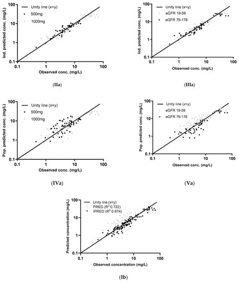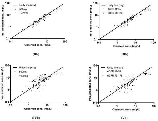 Individual (I [IPRED], II, and III) and population (I (PRED), IV, and V) concentrations, predicted using the parametric model (a) and the nonparametric model (b), plotted against the observed concentrations of the external dataset. The two dose groups, 500 mg and 1000 mg, are differentiated in graphs II and IV and two eGFR groups (measured by the CKD-EPI unadjusted for BSA) in graphs III and V. The log-transformed concentrations of the parametric model (a) are back transformed for an easier comparison with the untransformed concentrations in the figures of the nonparametric model (b).