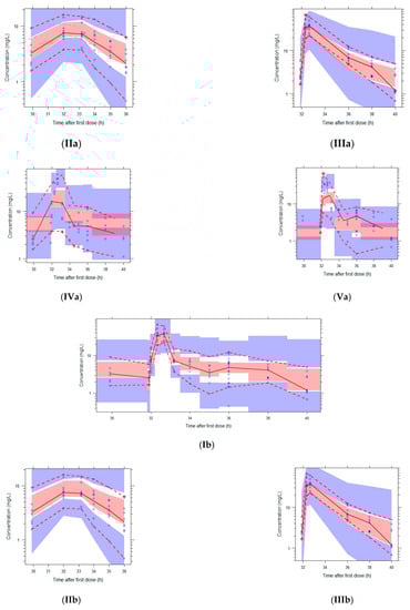 The proportion of observations between the 5th and 95th simulated percentiles in the VPCs in Figure 2 are: 96% (Ia), 95% (IIa), 94% (IIIa), 81% (IVa), 88% (Va), 96% (Ib), 97% (IIb), 96% (IIIb), 81% (IVb), and 95% (Vb).