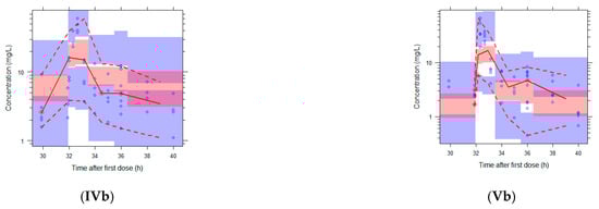The VPCs stratified on dose showed for both models a good predictive performance for the 500 and 1000 mg regimens, except for peak concentrations (Cmax) for the 1000 mg dose. This dose could not be tested during popPK modeling because the modeling population only used 500 mg. The higher than predicted Cmax is not likely to be explained by non-linear PK [22,31]. The most probable reasons for the Cmax deviation are the critical timing of the peak samples and the variable PK in critically ill patients [32], which is also shown by others [31,33,34,35]. However, it is important to realize that, instead of Cmax, the trough level is relevant for the targets of 50–100% fT > MIC. Importantly, the simulations did not show different prediction errors for trough levels after 500 mg and 1000 mg. Therefore, we decided to include 1000 mg dose regimens in the PTA simulations.