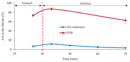 The microcrystalline AA reference yielded low solubility in the simulated fasted state intestine. In contrast, the TOS showed high apparent solubility throughout the measurement. For at least 75 min, over 60% of the dose passed the 220 nm filter used for the assays (Figure 2).