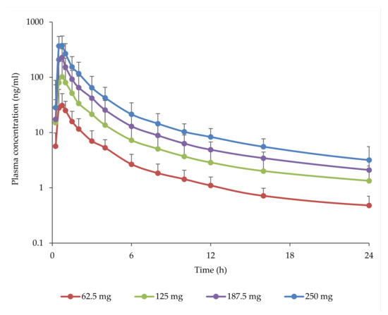 - Center for Drug Evaluation and Research. Guidance for Industry: Bioavailability and Bioequivalence Studies for Orally Administered Drug Products—General Considerations; Food and Drug Administration, US Department of Health and Human Services: Washington, DC, USA, 2003. [Google Scholar]