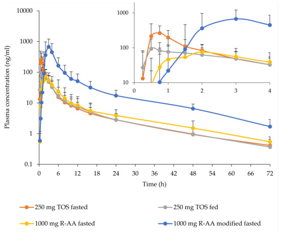 In both prandial states, plasma concentrations for TOS at 24 h were below plasma concentrations measured for R-AA at the same time in the fasted state. Plasma concentrations at 12 h, however, were similar to plasma concentrations observed for R-AA in the fasted state. (Figure 5).