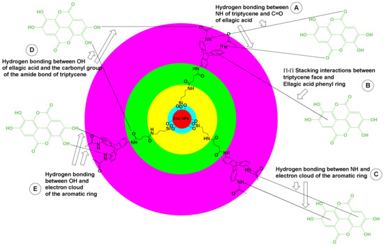 The possible link between the hybrid inorganic–organic nanoparticles and ELG molecules to form the nanoformulation. (A) Proposed hydrogen bonding between NH and C=O. (B) π–π stacking. (C) Hydrogen bonding between the NH and electron clouds. (D) Hydrogen bonding between OH and the carbonyl group. (E) Hydrogen bonding between OH and the electron clouds.