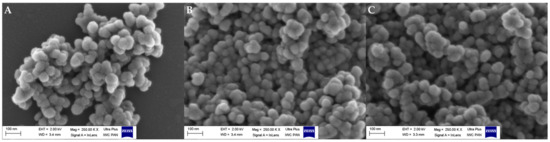 FE–SEM images of (A) ZnO NPs, (B) ZnO NPs–NH2–COOH–TRP, and (C) ZnO NPs–NH2–COOH–TRP–ELG.