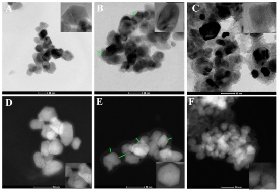The morphological structure when using STEM as the material after surface functionalization and ELG loading. (A) The images were taken by TEM for pristine ZnO NPs, (B) ZnO NPs–NH2–COOH–TRP, and (C) ZnO NPs–NH2–COOH–TRP–ELG. (D) The images were taken by STEM for ZnO NPs, (E) ZnO NPs–NH2–COOH–TRP, and (F) ZnO NPs–NH2–COOH–TRP–ELG. The green lines show the coating shell layer, as indicated by TRP-functionalized nanoparticles.