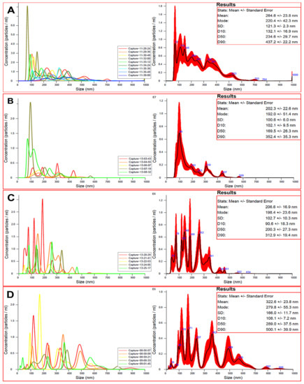 The particle size distribution determined by particle tracking analysis (PTA). (A) ZnO NPs; (B) ZnO NPs–NH2–COOH; (C) ZnO NPs–NH2–COOH–TRP; and (D) ZnO NPs–NH2–COOH–TRP–ELG.