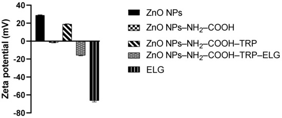 The zeta potential changes were measured for NPs (at different stages) suspended in deionized water. Figure 5 shows that the surface modification by carboxylic groups (ZnO NPs–NH2–COOH) changed the surface from a positive zeta potential (28.9 mV ± 0.4 mV) in ZnO NPs to a negative zeta potential (−1.60 mV ± 0.24 mV). Further attaching the Trp molecules to the carboxylic acid-modified NPs changed the surface back to a positive zeta potential, as indicated by ZnO NPs–NH2–COOH–TRP (18.9 mV ± 0.32 mV). The results agree with our recent study on ZnO NPs functionalized with various silanes, in which the zeta potential of NPs differed as the type of functionality changed [13]. By loading ELG, the surface of NPs gained a negative zeta potential (−15.8 mV ± 0.5 mV) in ZnO NPs–NH2–COOH–TRP–ELG). This observation is expected, due to the negative zeta potential of Elg (−66.2 mV ± 1.5 mV), which is in line with what we observed when loading protocatechuic acid onto modified ZnO NPs in our previous study [13]. Taken together, the findings indicate that the surface functionality modulates the zeta potential of the surface of ZnO NPs, affecting various aspects, such as cytotoxicity [42] and antimicrobial action [43].