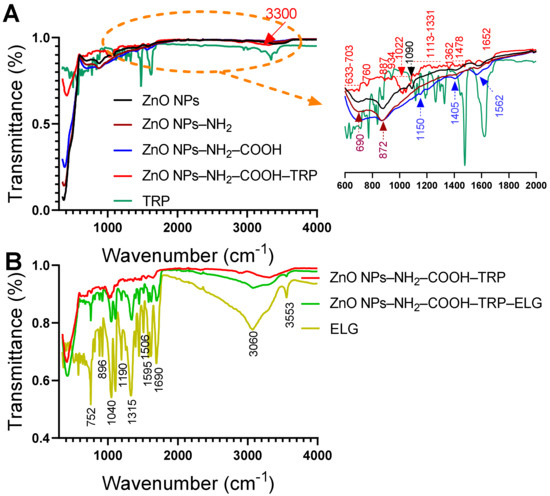 The FTIR–ATR spectra for ZnO NPs, before and after surface functionalization, are shown in Figure 6A. The most changes were detected in the range of 600–2000 cm−1. We used the similar parent ZnO NPs reported in our previous study, which are characterized by several distinguished bands (to not repeat, please refer to data in [13]). Compared to ZnO NPs, the amino-modified spectrum showed a relatively small increase in intensity at 690 cm−1 and 872 cm−1, whereas the peak at 1090 cm−1 disappeared. The band at 690 cm−1 may be attributed to Si–C streching vibration. The band at 872 can be assigned to Si–O–Si asymmetric stretching [44]. The appearance of these peaks confirms the attachment of amine groups from the APTES terminal silane to the surface of ZnO NPs [13,44,45]. Further modifying the amine-modified NPs with succinic acid anhydride, to obtain the carboxylic functional groups, resulted in new peaks. As seen in the FT–IR spectrum for ZnO NPs–NH2–COOH, peaks occurred at 1150, 1405, and 1562 cm−1, indicating the presence of carboxylic groups [46]. The peak at 1150 cm−1 can be related to C–O–C stretching, and the latter two peaks can be assigned to symmetric and antisymmetric COO− stretching [47]. After attaching TRP, new bands indicating free TRP in the spectra range between 600 to 1700 cm−1 appeared. These peaks strongly indicate the attachment of TRP and suggest an interaction between TRP and carboxylic-modified NPs. The region between 1000 and 1150 cm−1 can be corresponded to the stretch vibration of C–N bond. The main peaks at 1022 cm−1 and 3300 cm−1, indicating the amide bond formation. Consequently, we obtained the inorganic–organic hybrid material with the porous structure on the surface, due to attachement of TRP. We appear to be the first to report this nanohybrid structure. FT–IR data in line with TEM and STEM observations confirm that TRP is present on the surface of carboxylic acid-modified ZnO NPs. Figure 6B shows the differences in the functional groups in TRP-modified NPs, the nanoformulation, and free ELG. Several peaks, especially at 752, 896, 1040, 1190, 1315, 1506, 1595, 1690, 3060, and 3553 cm−1, were detected in the nanoformulation that correspond to free ELG, confirming ELG loading into/on TRP-modified NPs. Among other peaks, the peak at 1315 cm−1 can be related to the carboxyl group (C=O) stretching present in ELG, and the peak at 1690 cm−1 can be assigned to C=C stretching [48,49]. In addition, two peaks centered at 3060 cm−1 and 3553 cm−1 may correspond to O–H stretching vibrations and the carboxyl group in ELG. These data agree with our recent results for protocatechuic acid loaded on the surface of functionalized ZnO NPs [13].