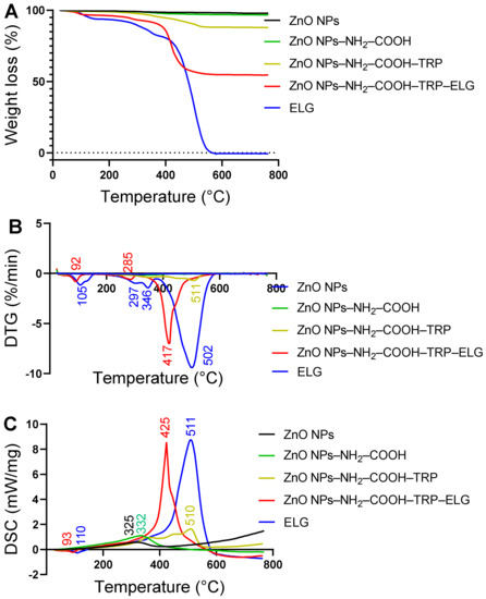 The thermal properties of materials at each preparation step are shown in Figure 7. As indicated by weight loss mass (Figure 7A), parent ZnO NPs and ZnO NPs–NH2–COOH (carboxylic acid-modified NPs) presented similar weight loss characteristics. As seen in Table 1, the mass loss did not change significantly between the two materials, with 2.2 and 3.3 wt.% for ZnO NPs and ZnO NPs–NH2–COOH, respectively. In contrast, ZnO NPs–NH2–COOH–TRP had significant mass loss (12.1 wt.%), with the main intensification of mass change kinetics between 320–550 °C and a peak centered at 511 °C, as indicated by the derivative thermogravimetric (DTG) curve (Figure 7B). The mass loss in this material is related to the decomposition of Trp molecules as organic matter. This mass loss shows the amount of TRP attached to NPs, which is likely as a surface coating. As expected, pure ELG decomposed (100 wt.%) in a manner characterized by three process steps (Figure 7A). As indicated by the DTG data (Figure 7B), the first decomposition was related to the removal of water, with a peak centered at ~105 °C; the second decomposition occurred at ~297 °C and 346 °C; the last main process at ~502 °C, relating to organic substance decomposition. The nanoformulation showed significant mass loss (~45.5 wt.%) and exhibited three phases of changing mass, as shown in the DTG pattern. The first phase of mass change, with a peak at ~92 °C, was associated with water evaporation from the nanoformulation, followed by small intensive decomposition at ~285 °C and, eventually the main decomposition at ~417 °C, which we attributed to the ELG decomposition. The total drug content of ELG in the nanoformulation was calculated to be > 33 wt.%, and the was entrapment efficiency ~83%, based on the weight loss principle (Table 1).
