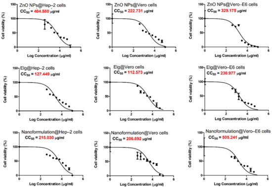 The CC50 of the tested materials against the investigated three cell lines are shown in Figure 8. The cytotoxicity against Hep–2 cells was detected in the order ELG > nanoformulation > ZnO NPs. In the case of Vero cells, ELG had higher inhibition than the nanoformulation and ZnO NPs, respectively. For Vero–E6 cells, the cytotoxicity was detected in the order ELG > ZnO NPs > nanoformulation. This observation confirms that ELG has greater cytotoxic effects alone. The CC50 determined for each material was used for the antiviral investigation.