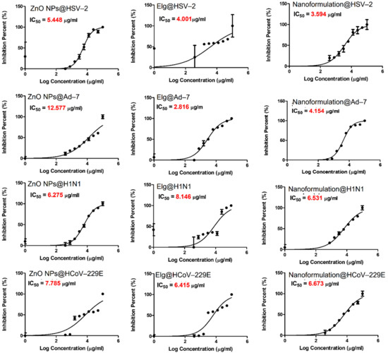 These findings are in line with our previous data [9], the proposed action for the virucidal mechanism can be related to surface chemistry of nanoformulation with carboxylic groups (from ELG) that have interacted with amine groups of the glycoproteins available on the virus surface. Based on the extensive research to screen several clinical drugs or explore new compounds against COVID-19, HCoV-229E is a good primary virus model and could be suitable for exploring specific anti-COVID-19 activity [50]. In this context, Parang et al. [50] evaluated remdesivir, which is an anti-HIV agent, and demonstrated that it inhibits HCoV-229E at an IC50 of 0.07 µM with an SI > 28 µM. Furthermore, Cheng et al. [51] studied the plant-derived saikosaponins and revealed potent anti-coronaviral activity of saikosaponin B2 against HCoV-229E at ~1.7 µg/L, with an SI > 200 µg/L through interference in the early viral replication stage, including in the absorption and penetration of the virus. It seems that the antiviral efficiency of either drugs or natural agents can vary; however, our findings are promising because of the low IC50 and high SI obtained against RNA viruses, especially HCoV-229E. Additionally, the use of ZnO NPs in the nanoformulation can also allow various routes of application for viral infections.