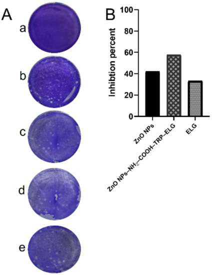 The virucidal mechanism and percent inhibition against coronavirus (HCoV-229E). (A) The cytotoxicity control (a), virus control (b), nanoformulation (c), ZnO NPs (d), and ELG (e). (B) The percent inhibition of coronavirus (CoV–229E) was calculated from the plaques formed through the virucidal mechanism.