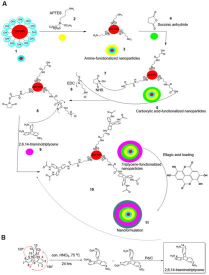 Preparation steps for the nanoformulation. (A) Synthesis of the nanoformulation from ZnO NPs (1) reacted with APTES silane molecules (2) to obtain amine-functionalized nanoparticles (3). The functionalized nanoparticles are further reacted with succinic anhydride (4), resulting in carboxylic acid–functionalized nanoparticles (5). The later nanoparticles are activated through 1-(3-dimethylaminopropyl)-3-ethylcarbodiimide hydrochloride (EDC, (6))/N-hydroxysuccinimide (NHS, (7)), leading to the coupling chemistry, shown in step (8). Triptycene (9) is then further reacted to obtain the hybrid inorganic/organic structure nanoparticles (10). Finally, the hybrid is used to load/impregnate the ellagic acid natural agent prodrug to reach the nanoformulation (11). (B) The full steps were followed to obtain triaminotriptycene (TRP).