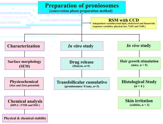Proniosomes were prepared by the modified coacervation phase separation method (Figure 1) described by Shah et al. [24]. Briefly, various mixtures of span 60/cholesterol (Total lipid 10–30 mM), cholesterol (30–50%), and FN concentrations (1.5–5 mM) were accurately weighed (Table S1) and dissolved in 5 mL absolute ethanol. The mixture was warmed in a water bath (Julabo SW23, JULABO GmbH; Seelbach, Germany) at 60 °C for 5 min. Then, 1 mL of deionized water was added, and the mixture was kept in the water bath until the clear solution formed. The mixture was allowed to cool down to room temperature till the dispersion was converted to proniosomes. The FLP with varying FN concentrations (0.1, 0.5, and 1% w/w) were prepared. The prepared proniosomes were studied. The optimum FLP was investigated further to induce the hair growth study. The components of FLP are listed in Table S2 (Supplement file), and the study’s methodology is illustrated in Figure 2.