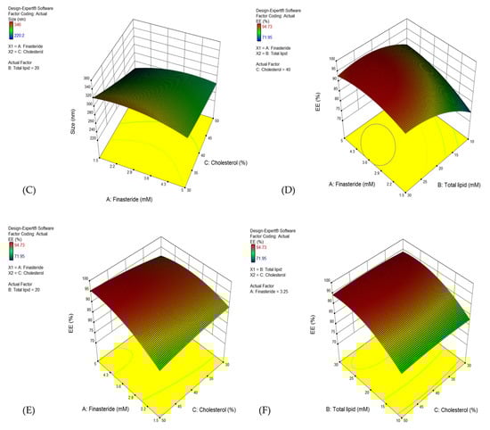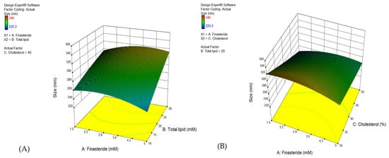 The factors affecting the vesicle size are presented in Table S3 and Figure 3. The lipid (X2) and cholesterol (X3) concentrations affect the formulation. Moreover, all interactions (X1X2, X1X3, and X2X3) and quadratic terms (X12, X22, and X32) were significant. The correlations between variables and vesicle size were obtained from regression analysis.