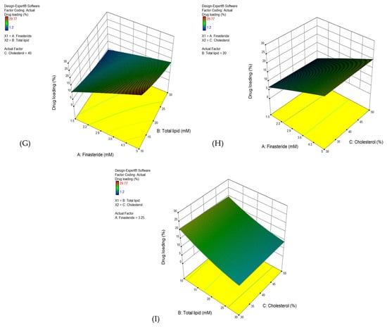 The 3-D surface response plots demonstrate the effect of FN concentration, total lipid content, and cholesterol proportion in total lipid on the vesicle size (A–C), % Entrapment efficiency (D–F), and % Drug loading capacity (G–I) of FLP.