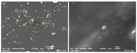 The prepared niosomes were visualized by SEM (Figure 4). It was found that niosomes have a uniform spherical morphology with a smooth surface. The particle size of the niosomes was in the range of 170–320 nm.
