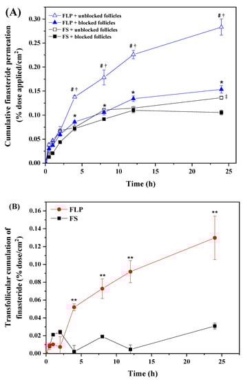 The cumulative amounts of FN in porcine skin by follicular closing technique (A) and calculated transfollicular accumulation (B). # p < 0.05 compared between FLP and FS unblocked follicles’ cumulation; † p < 0.05 compared between unblocked and blocked follicles’ cumulation of FLP; * p < 0.05 compared between FLP and FS blocked follicles’ cumulation; ‡ p < 0.05 compared between unblocked and blocked follicles’ cumulation of FS; ** p < 0.05 compared between FLP’s and FS’s cumulation.