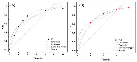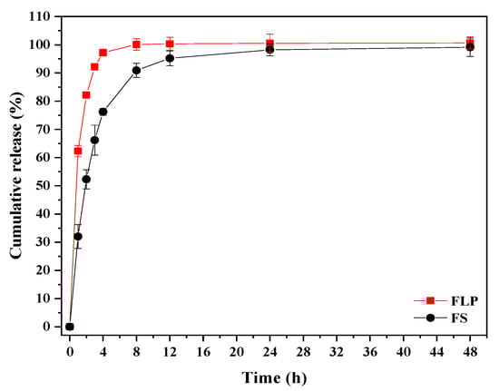 The kinetic release of FS and FLP are presented in Figure 7. The kinetic parameters of the release behavior of both samples are listed in Table 4. The first-order model provides the best correlation (R2 ≥ 0.99) to describe the drug release mechanism of both formulations. By considering the rate constant (k), it is found that the FS exhibits faster release than FLP.