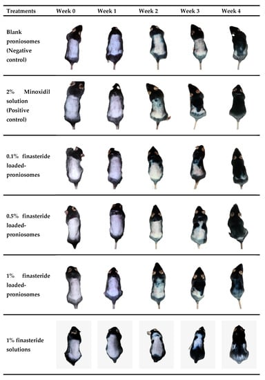 The results confirmed that using 5.0 mM of FN, 10.1 mM of total lipid content, and 50.0% of cholesterol could produce effective FLP. About 2.41 ± 0.45 µg/cm2 of FN was delivered successfully via the transfollicular route by the proniosomes. In the experimental mice model, the treatment with 1% FLP enhanced hair growth effectively in terms of the number and size of hair follicles. The prepared FLP did not cause any irritation in the skin. Accordingly, the results revealed that FLP could be used to inhibit the Type I 5α-reductase, which may aid in managing hair loss without any adverse side effects. Further studies are recommended to develop and commercialize the FLP-based hair loss preventive pharmaceutical agents.