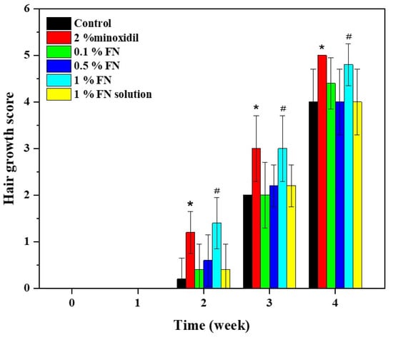 C57BL/6mlac mice are commonly used to study hair growth-related studies, since the animal has a hair cycle and hair growth pattern similar to humans, with the difference in the hair cycle length [60,61]. Though the hair follicle dimensions differ in animals compared to human skin, no differences were found in the penetration depths of nanoparticles (~320 nm) between human skin and porcine ear skin [62]. The minoxidil-loaded niosomes displayed increased transfollicular bioavailability and attained superior cutaneous delivery, enhancing skin penetration and increasing the number of hair follicles [63]. The results of the current study revealed that the proniosomes enhanced the desired drug (FN) delivered to the targeted site, stimulating hair growth [17,64]. The hair growth stimulating the ability of the FLP was comparable to minoxidil in a dose and time-dependent manner (Figure 8 and Figure 9).