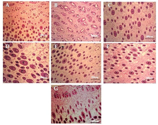 The histological method was used to observe the hair follicles of mice [36]. All mice were sacrificed at the end of the hair growth study, and full-thickness skin biopsies were fixed in 10% buffered formalin. The skin biopsies (n = 4) were embedded in paraffin and stained with hematoxylin and eosin (H&E) for histopathological assessment under a light microscope (Olympus; Heidelberg, Germany).
