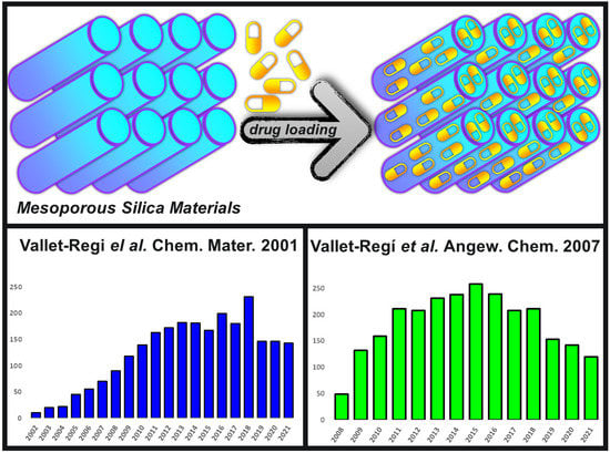 Top: Schematic representation of the original idea of loading drugs into the network of pores of mesoporous silica materials. Bottom left corner: Cites distribution along the last 20 years of the original communication where MSMs were presented as drug delivery systems, adapted from [], published by American Chemical Society, 2001. Bottom right corner: Cites distribution of one of the most important reviews on this topic reported on Angewandte Chemie after only 6 years of the original research paper, adapted from [], published by Wiley-VCH, 2007.